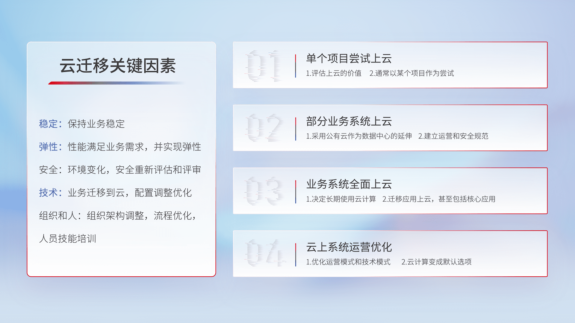 结合实际业务,,,,从规划设计、、云平台选型、、、、云原生改造、、、、数据迁移、、、集成交付,,,迁移全过程为客户识别最佳上云路径,,,做好风险识别管理,,设计网络架构、、身份权限、、、、安全审计合规、、、、操作审计、、、日志审计、、、、监控告警策略、、多站点容灾设计等,,,,对云上基础设施进行整体规划,,提升IT治理水平,,以满足弹性、、、高可用、、高性能的需求。。。