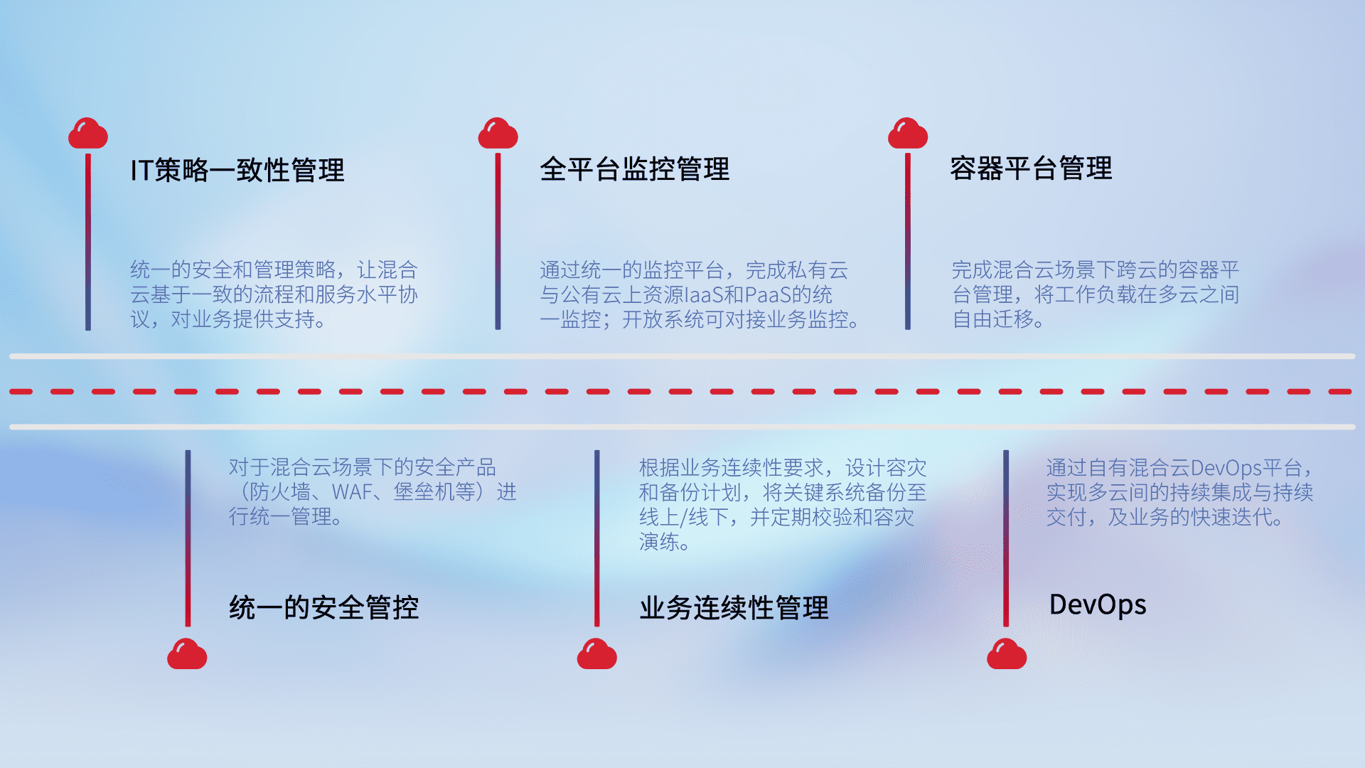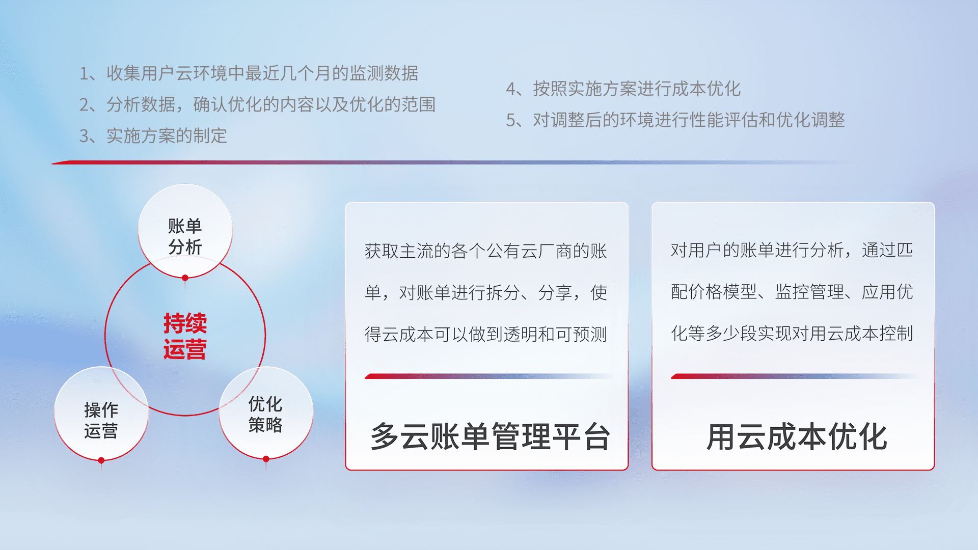 通过多云纳管,,以统一的资源数据模型把客户的云资源进行抽象和封装,,进而实现对多云资源的统一操作,,保障云资源管理的可靠性、、稳定性与可用性。。。量身定制化运维内容,,配置、、、、开发运维、、、、补丁管理、、、备份、、、、监控、、认证和访问管理、、审计和日常巡检等,,,,保障在用云过程中的可靠度,,,稳定度以及高可用率。。。