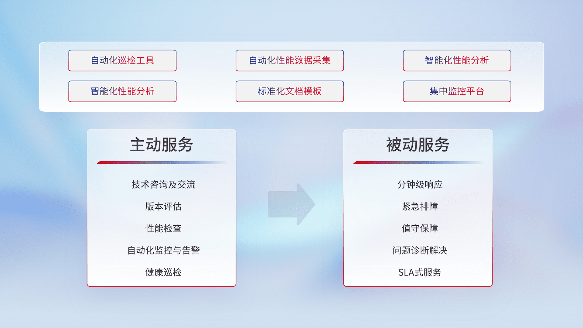 智能化工具和标准化文档,,保障服务质量,,提供主动服务(包含技术咨询、、、、版本评估、、、性能检查、、、自动化监控与告警、、健康巡检)和被动服务包含(分钟级响应、、、紧急排障、、值守保障、、问题诊断解决、、、SLA服务)。。。。